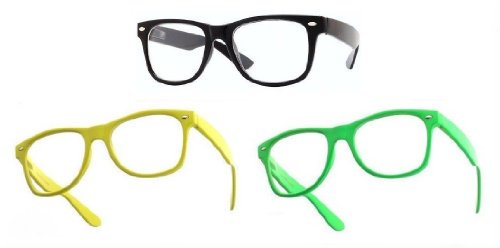 Geek Verre Neutre Transparent Vert + Jaune dès Monture style Wayfarer Geek Retro Vintage 80's Lot de 3 paires de lunettes monture style